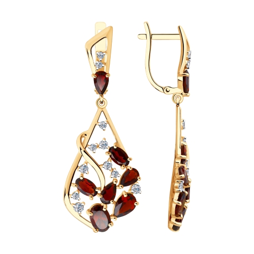 Восхитительные серьги с подвесками, с изысканным узором из мерцающих фианитов и натуральных гранатов, выполнены из красного золота 585 пробы. Серьги с эффектным сиянием обворожительных камней великолепно и нарядно смотрятся, и станут роскошным украшением вечернего образа обладательницы. Приобретайте ювелирное украшение по выгодным ценам в магазинах Мир Золота.