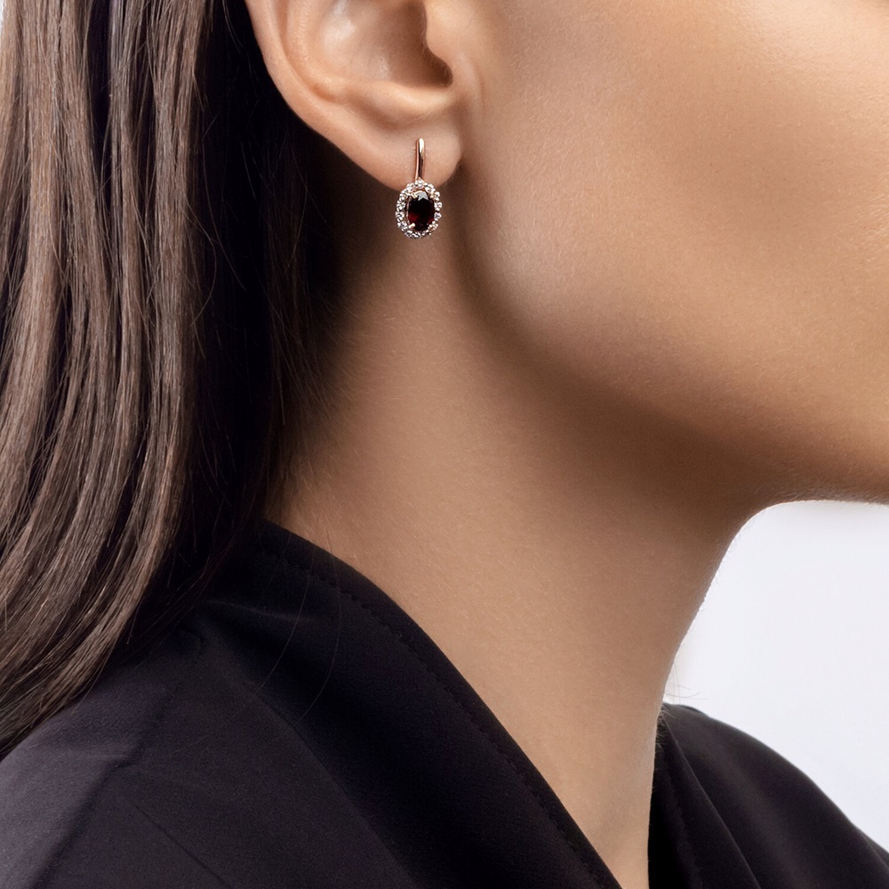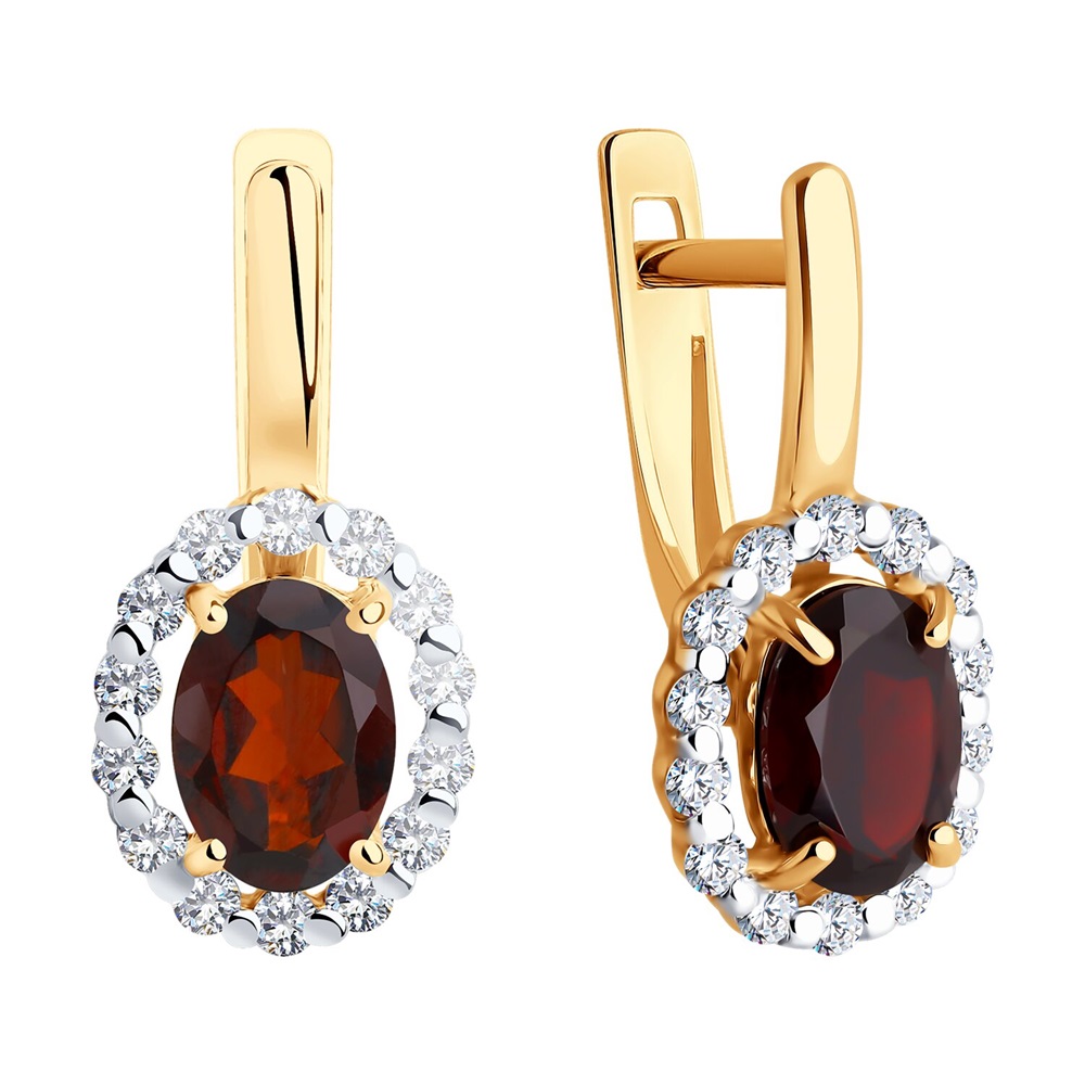 Восхитительные серьги из красного золота 585 пробы с натуральными гранатами и фианитами. Яркие насыщенные гранаты в плену сверкающего кружева из прозрачных фианитов приковывают внимание, и никого не оставят равнодушным. Серьги очень эффектно и нарядно смотрятся, и идеально дополнят праздничный и вечерний наряд. Элегантное украшение будет великолепно смотреться с кольцом из комплекта. Приобретайте серьги для чудесного подарка, выгодно в магазинах Мир Золота.
