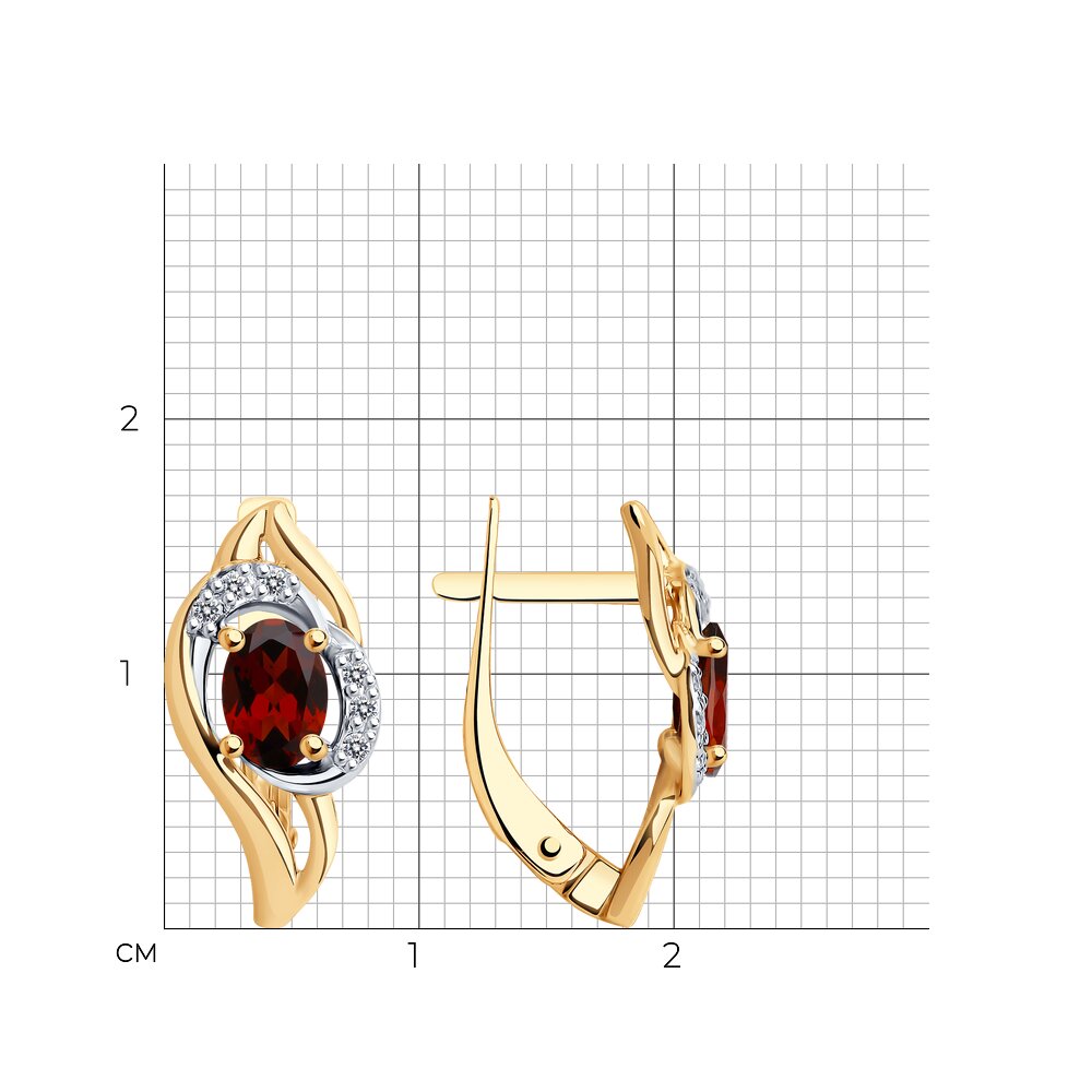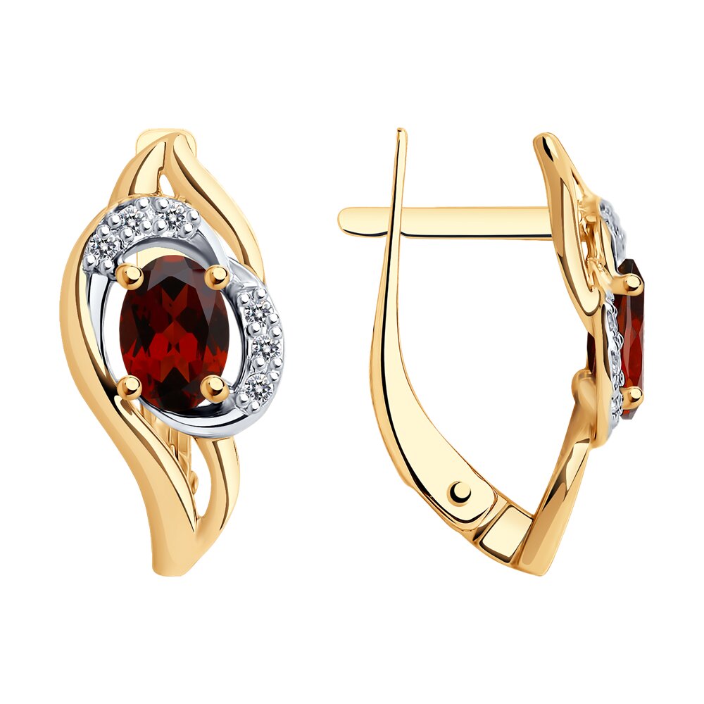 Замечательные серьги красивого дизайна, декорированы натуральными гранатами и фианитами, выполнены из красного золота 585 пробы. Женственное украшение с плавными линиями золота и фигурными фианитовыми дорожками, выгодно подчеркивающими насыщенный цвет гранатов., будет универсальным аксессуаром для любого образа. Приобретайте ювелирное украшение по выгодной цене в магазинах Мир Золота.