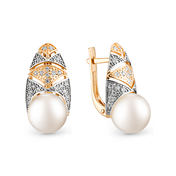 Эффектные стильные серьги из красного золота с ослепительным блеском кристальных фианитов и нежным утонченным сиянием белоснежного жемчуга покоряют своей красотой. Драгоценный металл идеально подчеркивает яркое сияние ювелирных камней, украшение смотрится благородно и элегантно. Приобретайте серьги для себя или в подарок по выгодным ценам в магазинах Мир Золота.