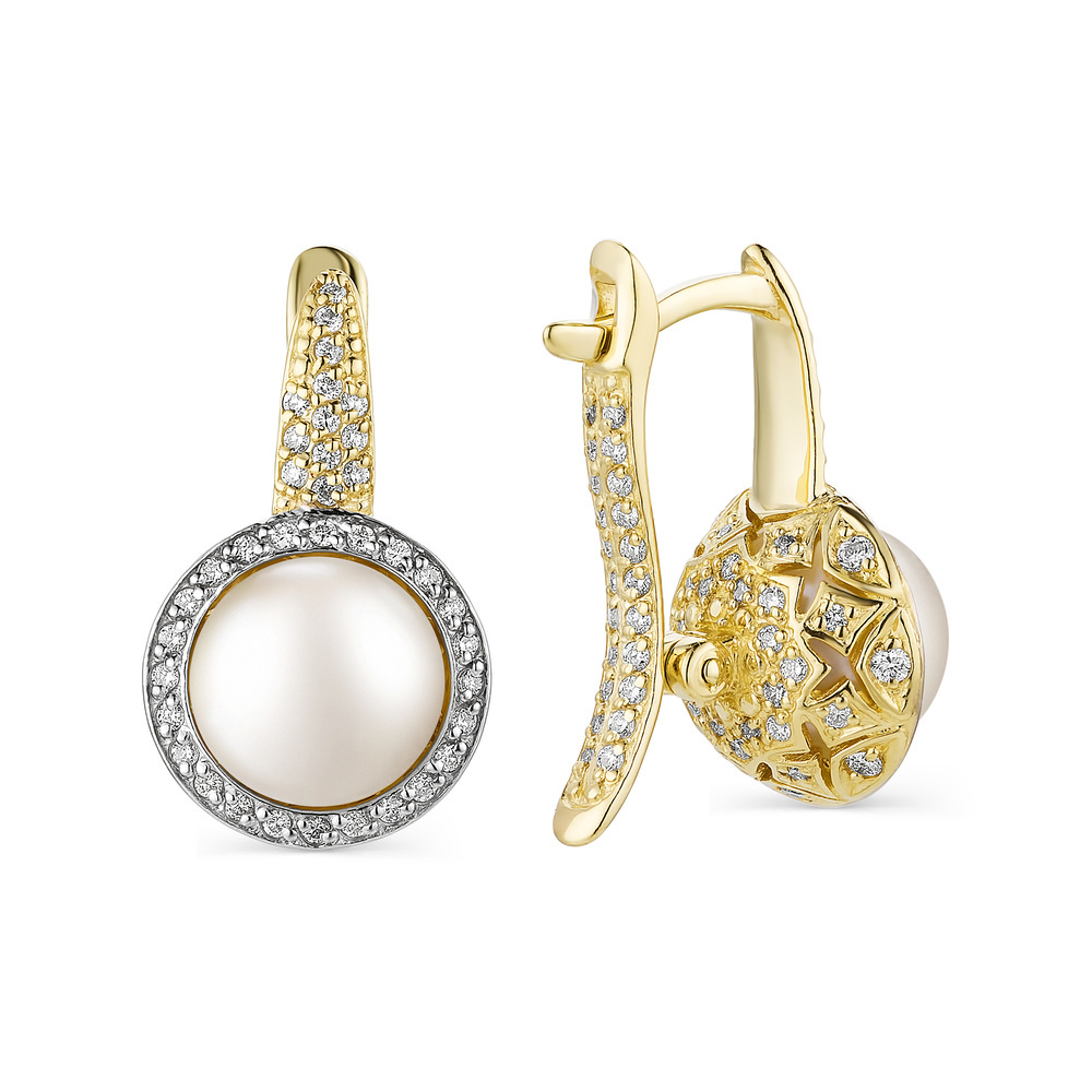Необыкновенные серьги выполнены в оригинальном дизайне из красного золота и декорированы круглым белым жемчугом и россыпью кристальных фианитов. Украшение очень эффектно выглядит, изысканный дизайн с ослепительным блеском камней не останется незамеченным, и вдохновляет на создание неповторимого женского образа. Приобретайте украшение выгодно в магазинах Мир Золота.