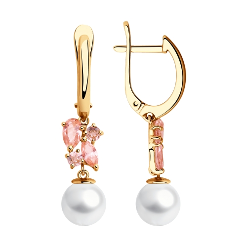 Серьги с подвесками с натуральным белым жемчугом и розовыми ситаллами выполнены из красного золота 585 пробы в очаровательном дизайне. Утонченное перламутровое сияние жемчуга и завораживающий нежный блеск ситаллов идеально украсят чувственный и неповторимый женский образ. Приобретайте замечательное украшение в подарок для ваших любимых по выгодным ценам в магазинах Мир Золота.