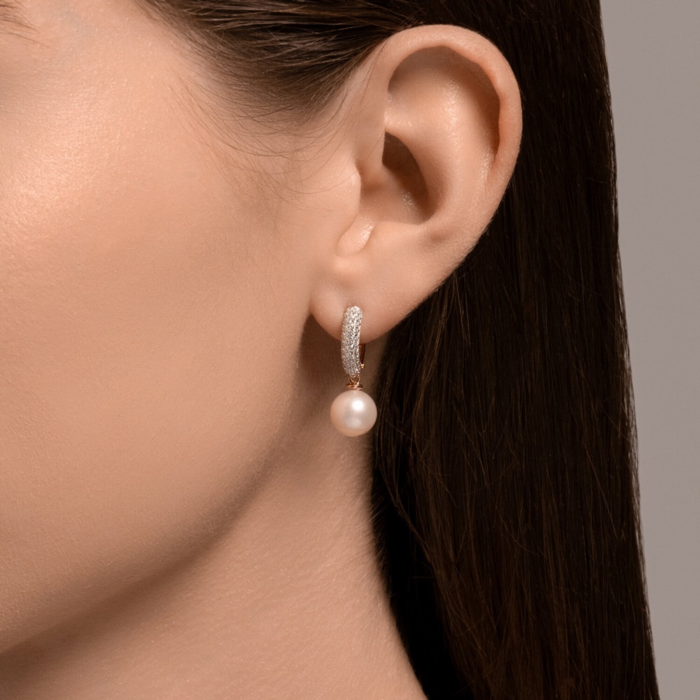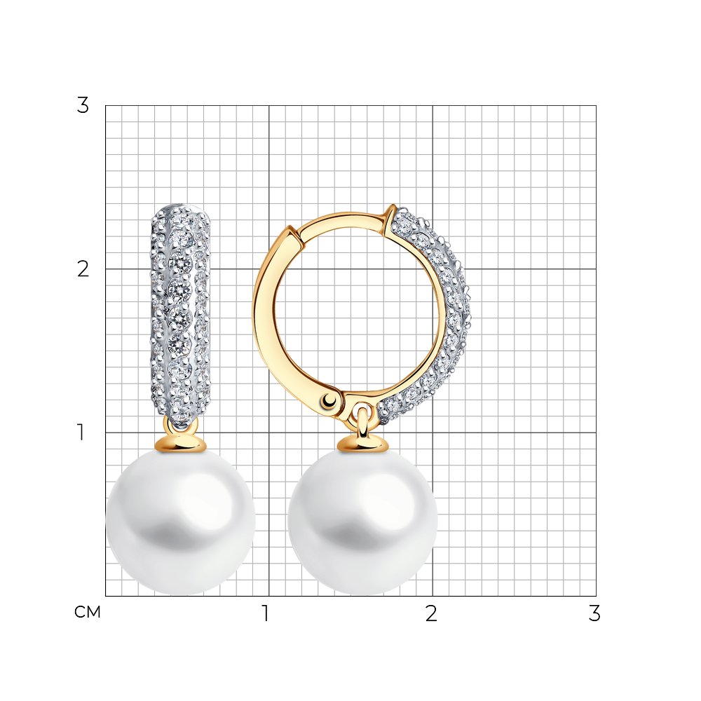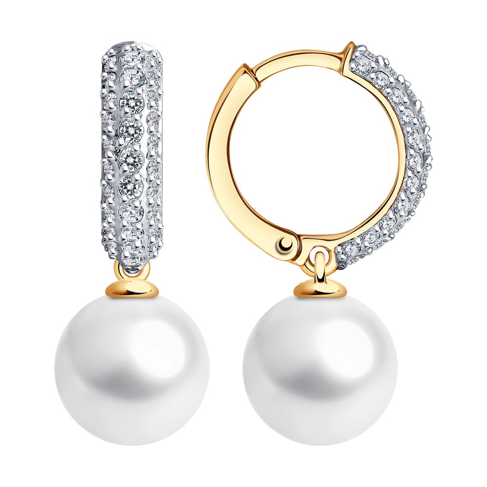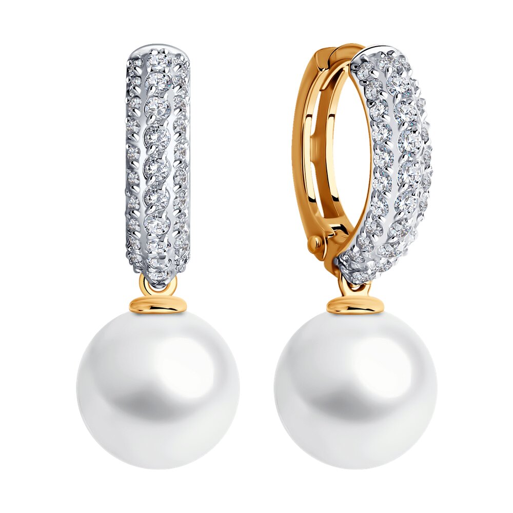 Элегантные серьги с подвесками из красного золота 585 пробы, с натуральным жемчугом и россыпью прозрачных фианитов, очень женственно и стильно смотрятся. Нежное и яркое украшение с эффектным сиянием камней великолепно украсит вечерний и нарядный образ владелицы. Приобретайте изысканное украшение в подарок, выгодно в магазинах Мир Золота.