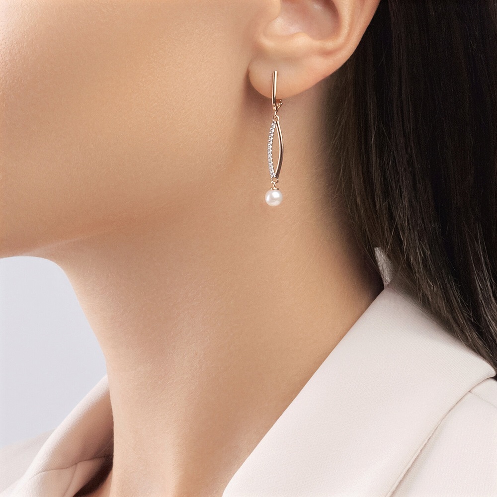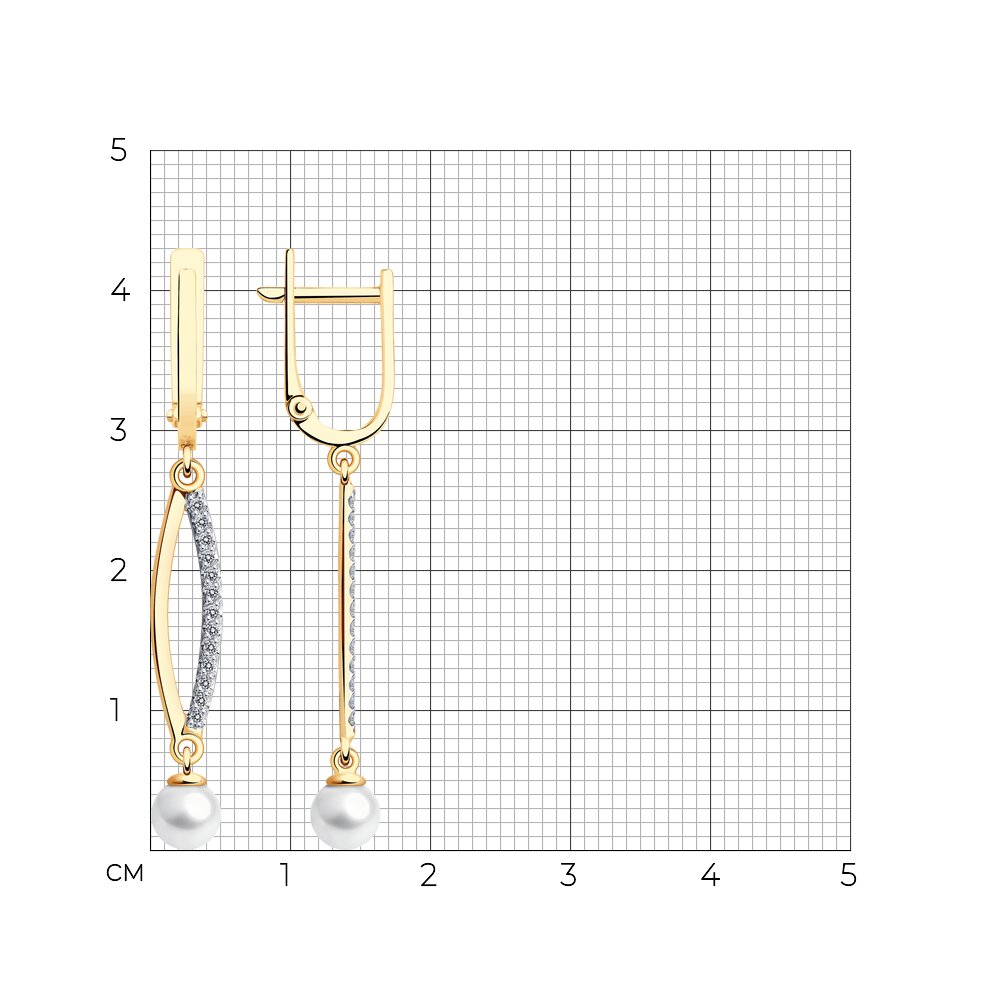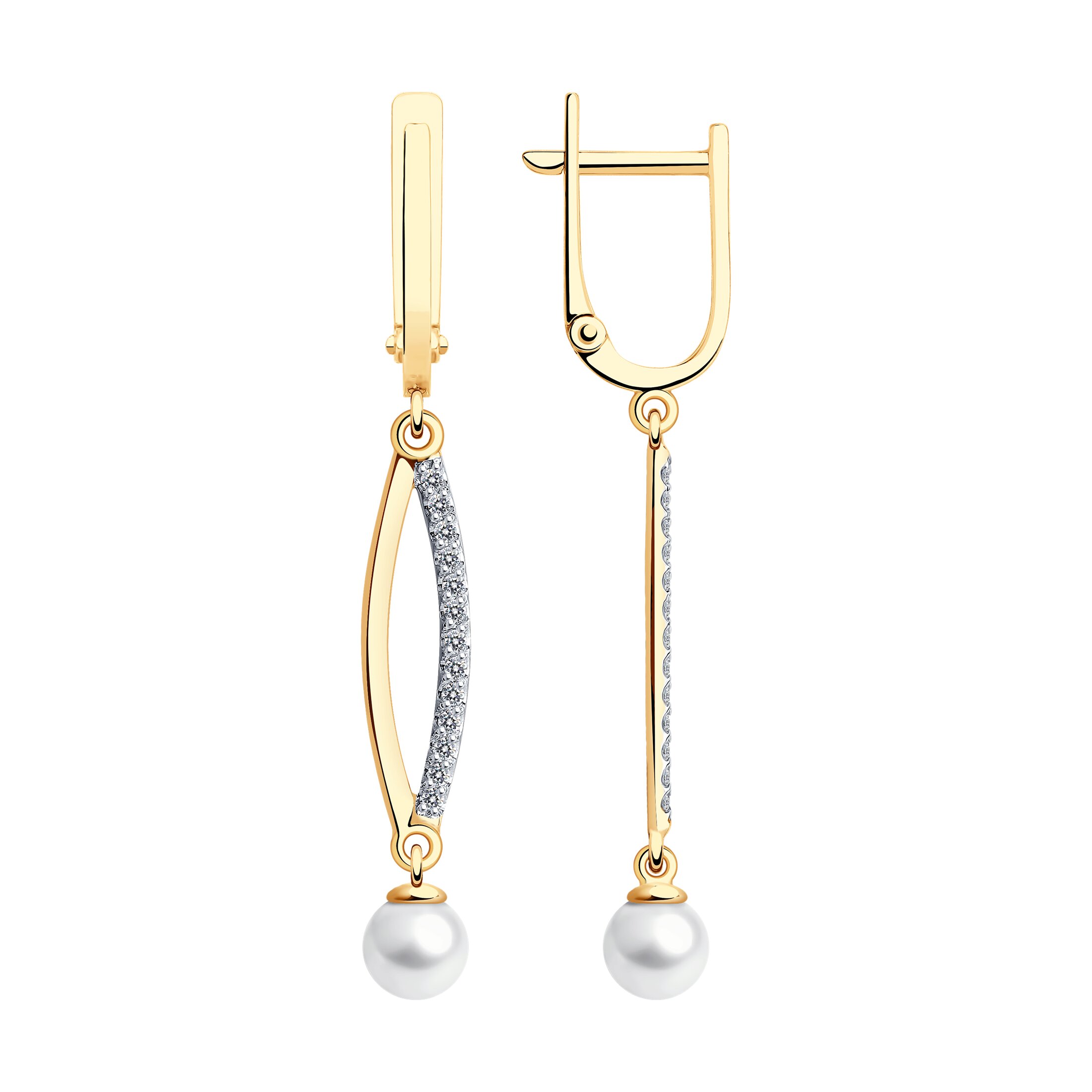 Удлиненные серьги с подвесками с натуральным жемчугом и фианитами выполнены из красного золота 585 пробы в утонченном дизайне. Серьги смотрятся очень нежно и женственно, и прекрасно дополнят элегантные образы, покоряя своей красотой и изяществом. Приобретайте золотое украшение для своей коллекции или в подарок, по выгодной цене в магазинах Мир Золота.