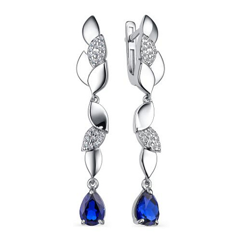 Удлиненные серьги с подвесками с сапфировыми корундами и фианитами выполнены в современном привлекательном дизайне из родированного серебра 925 пробы. Украшение с очаровательным блеском ювелирных камней привлекает внимание, и идеально дополнит нарядный и вечерний образ владелицы. Тип замка: английский. Приобретайте ювелирное украшение для себя или в подарок по выгодным ценам в магазинах Мир Золота.