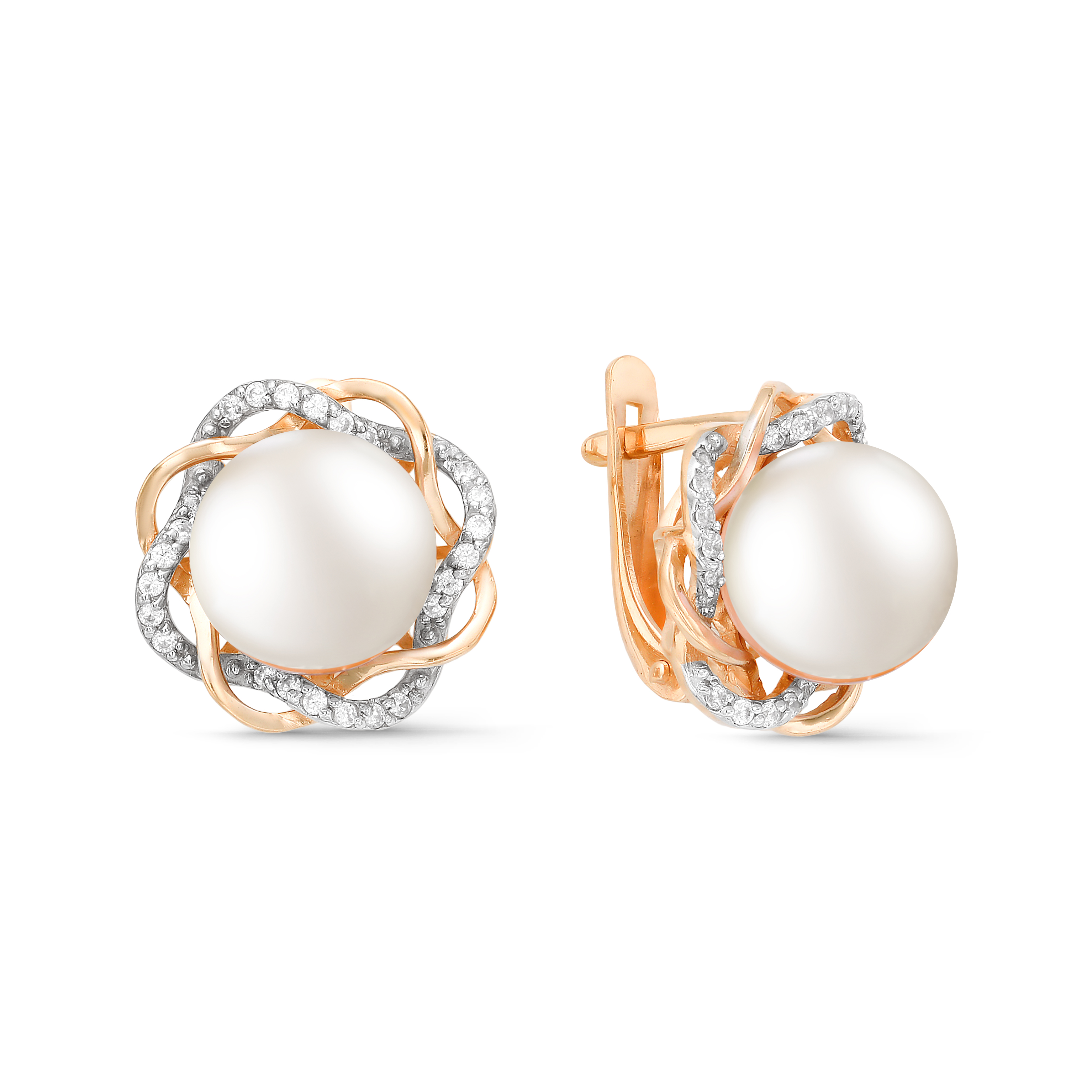 Изящный изумительный дизайн женских серег из красного золота привлекает внимание удивительным блеском крупных перламутровых жемчужин и прозрачных фианитов. Украшение изысканно и очаровательно смотрится, мерцающий блеск фигурных фианитовых дорожек придает изделию более нарядный вид, и выигрышно подчеркивает нежный оттенок природного жемчуга. Приобретайте ювелирное украшение по выгодной цене в магазинах Мир Золота.