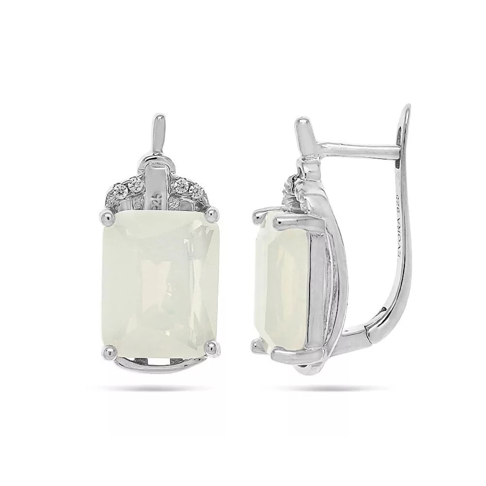 Серьги из родированного серебра 925 пробы с выразительным лунным камнем и декоративными вставками с прозрачными цирконами. Стильное украшение с крупными белыми камнями прямоугольной формы огранки элегантно смотрится, и дополнит своим привлекательным блеском любой повседневный или вечерний наряд. Приобретайте ювелирное украшение выгодно в магазинах Мир Золота.