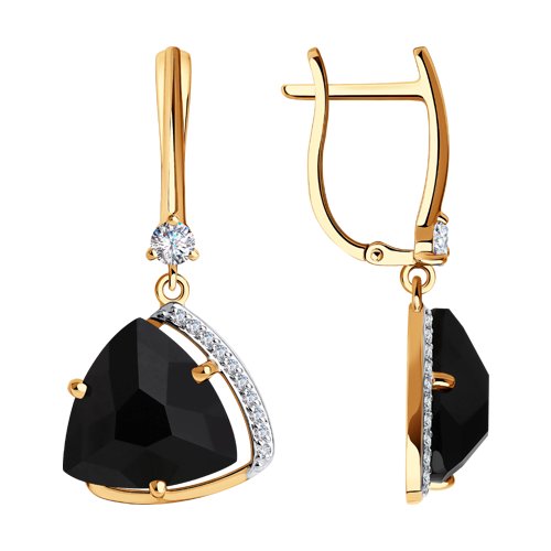 Превосходные серьги с черным ониксом и прозрачными фианитами выполнены в современном дизайне из красного золота 585 пробы. Притягательное сияние крупных камней необычной огранки Триллион приковывает внимание, стильное украшение эффектно дополнит яркие образы современной леди. Приобретайте ювелирные серьги по выгодной цене в магазинах Мир Золота.
