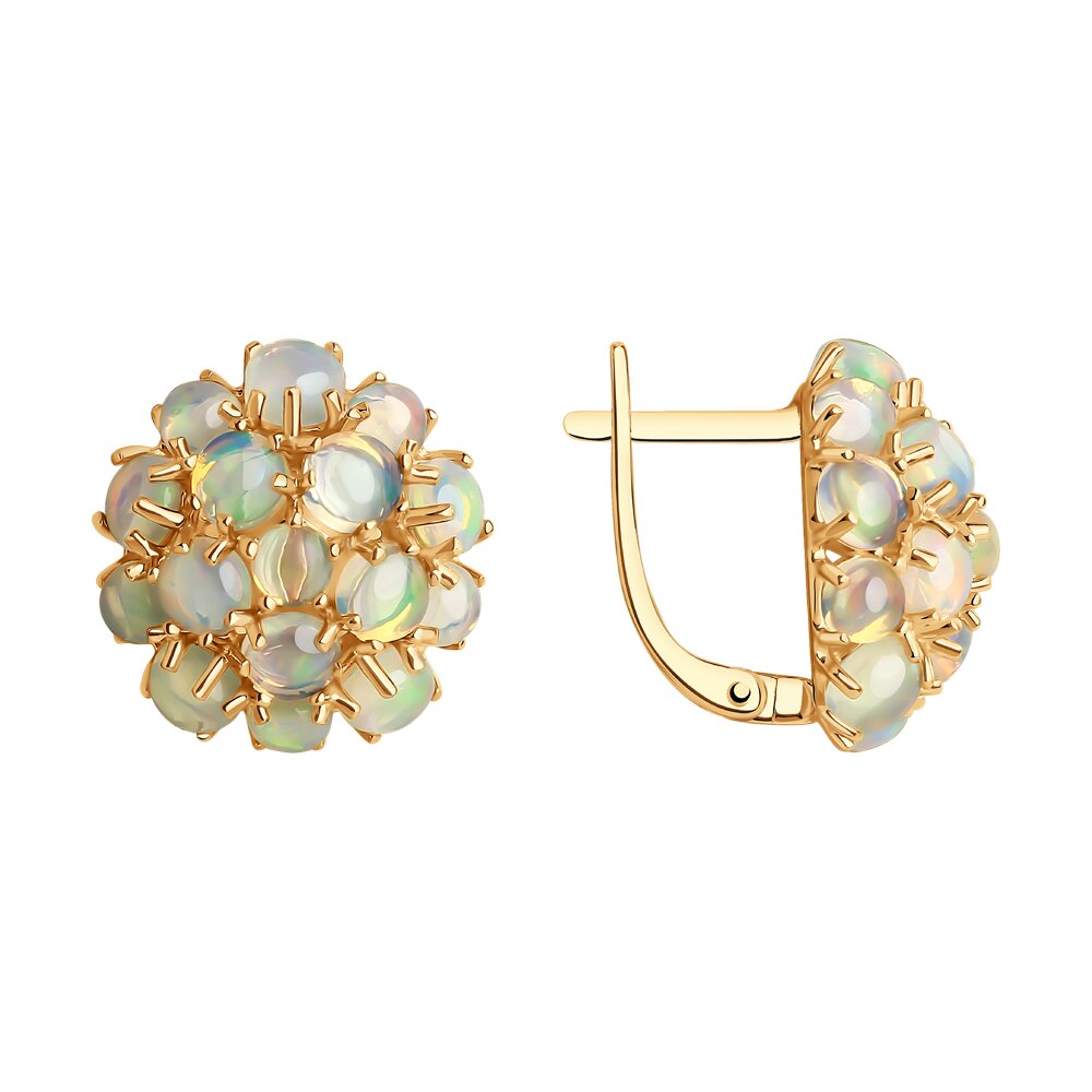 Эффектные серьги на английском замке выполнены из красного золота 585 пробы с объемным декором из камней натурального опала. Нежное мягкое сияние ювелирных камней дополнено благородным блеском золота, украшение нарядно смотрится, и станет прекрасным дополнением неотразимого женственного образа. Приобретайте серьги в подарок по выгодным ценам в магазинах Мир Золота.