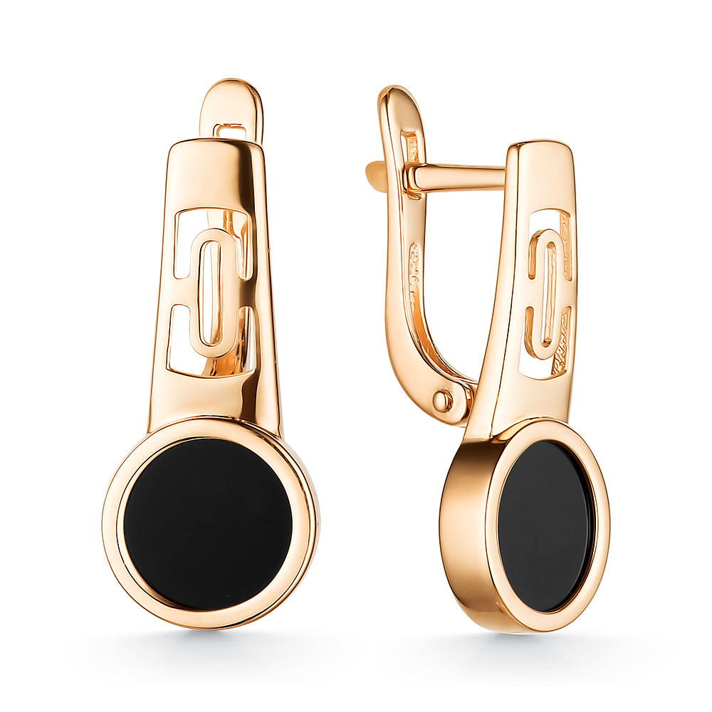 Стильные серьги на английском замке с черным ониксом выполнены из красного золота 585 пробы. Выразительное украшение с эффектным акцентом черных камней изысканно дополнит любой выбранный образ, и подчеркнет индивидуальность и женственность владелицы. Приобретайте ювелирное украшение для себя или в подарок по выгодным ценам в магазинах Мир Золота.