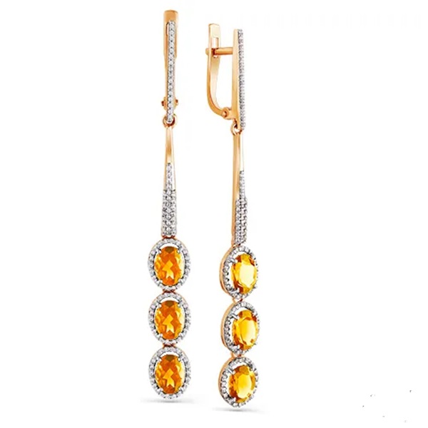 Удлиненные серьги с подвесками с цитринами и фианитами, из красного золота 585 пробы, очень женственно и нарядно смотрятся. Яркие серьги восхищают своей неотразимой красотой и великолепием, и позволят создать по-настоящему изысканный образ. Приобретайте ювелирное украшение в подарок по выгодным ценам в магазинах Мир Золота.