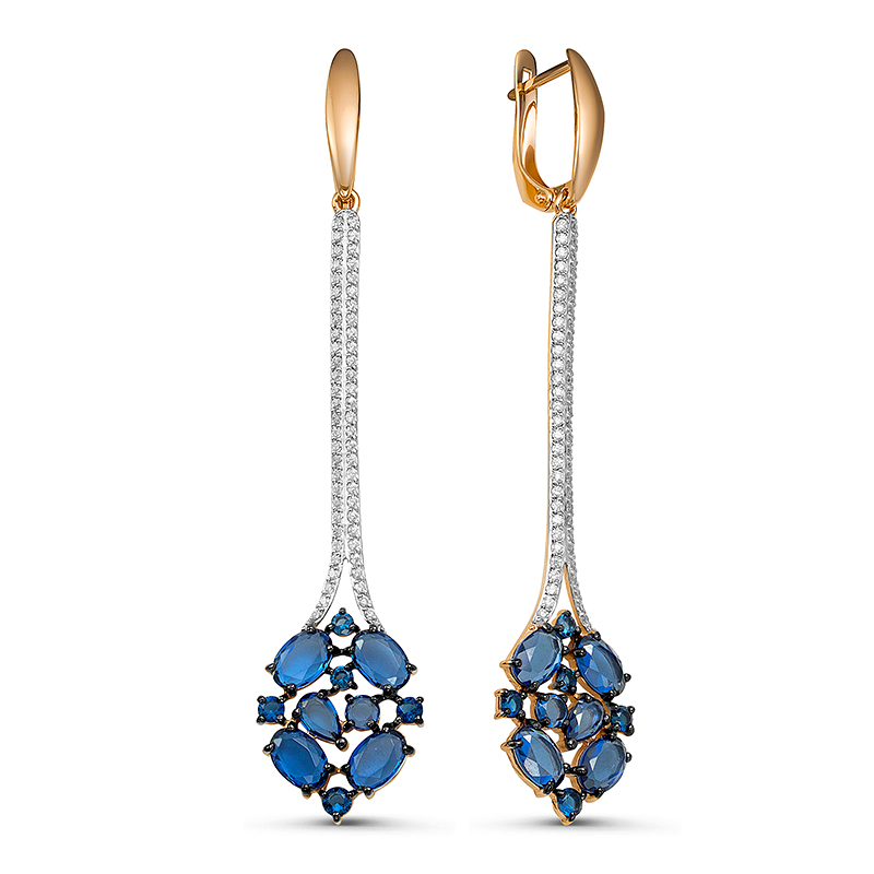 Длинные серьги с эффектными подвесками выполнены из красного золота 585 пробы с сапфировыми ситаллами, кварцем и фианитами. Яркий аксессуар с синими и прозрачными камнями великолепно украсит неповторимый женственный образ, и станет идеальным дополнением вечернего и праздничного наряда. Приобретайте ювелирное украшение в подарок по выгодной цене в магазинах Мир Золота.