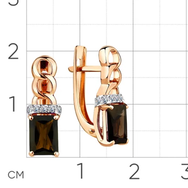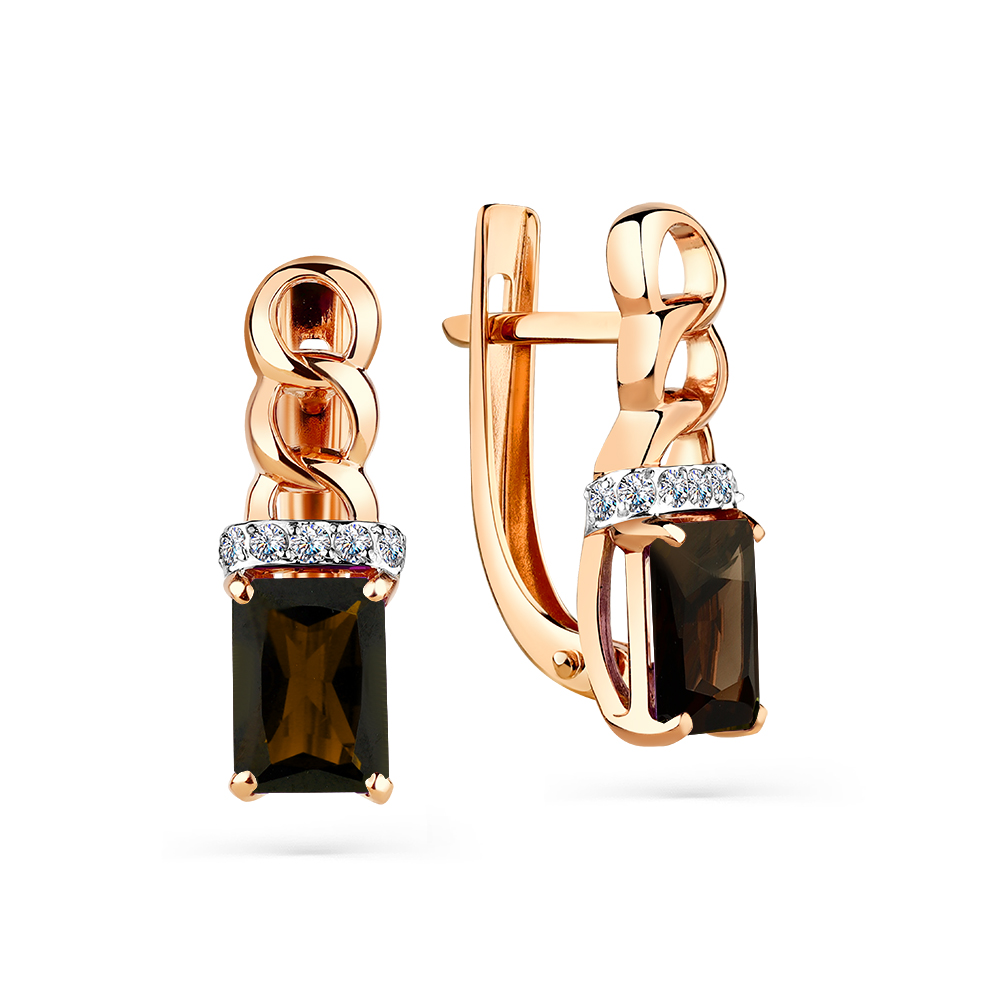 Серьги с английским замком с превосходными раухтопазами и фианитами выполнены из красного золота 585 пробы. Интересный дизайн с сияющими вставками с прозрачными фианитами, подчеркивающими удивительный блеск и притягательную красоту основного камня, привлекает внимание, и эффектно дополнит изысканный образ владелицы. Покупайте ювелирное украшение выгодно в магазинах Мир Золота.