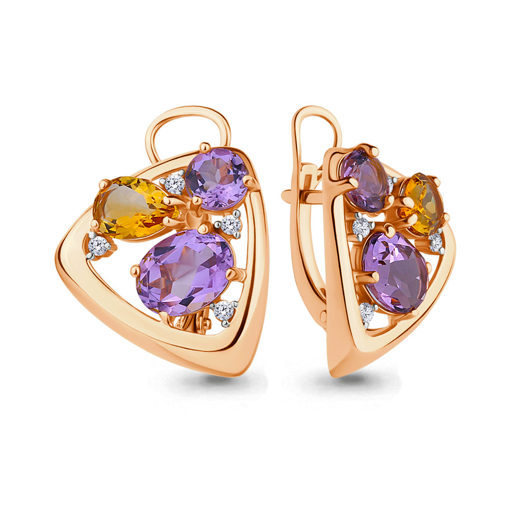 Серьги необычного дизайна выполнены из красного золота 585 пробы с миксом разноцветных камней цитрина, аметистов и фианитов. Эффектное сочетание цветных камней привлекает внимание своим изумительным переливчатым блеском, украшение идеально дополнит стильные современные образы обладательницы. Покупайте украшение по выгодной цене в магазинах Мир Золота.