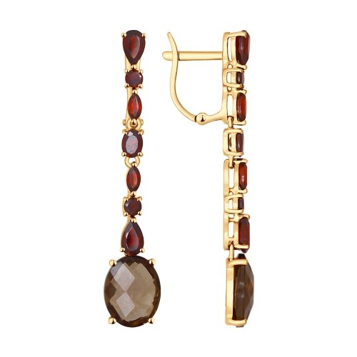 Удлиненные серьги из красного золота 585 пробы украшены миксом камней раухтопаза и гранатов. Изумительный дизайн и оригинальное сочетание ярких полудрагоценных камней эффектно дополнят утонченный женственный образ владелицы, серьги станут незаменимым украшением для вечернего и праздничного наряда. Приобретайте украшение в подарок выгодно в магазинах Мир Золота.
