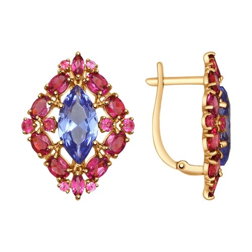 Бесподобные серьги из красного золота 585 пробы с объемным декором в виде ромба с полудрагоценными вставками с ситаллами и родолитами. Яркие ситаллы в окружении розового сияния родолитов привлекают внимание, украшение эффектно подчеркнет очарование и стильный образ владелицы. Тип замка: английский. Приобретайте серьги в подарок на любой праздник, выгодно в магазинах Мир золота.