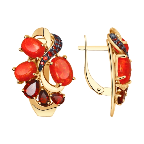 Крупные серьги превосходного ювелирного дизайна с миксом камней натурального граната, синтетического опала и цветных фианитов выполнены из красного золота 585 пробы. Яркая и выразительная композиция из цветных камней идеально сочетается с драгоценным блеском золота, серьги эффектно украсят женский образ и не останутся незамеченным. Приобретайте ювелирное украшение по выгодным ценам в магазинах Мир Золота.