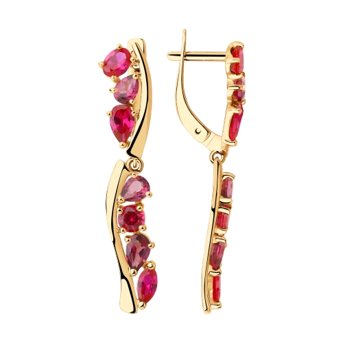 Серьги необычного дизайна с подвесками украшены корундами и родолитами, выполнены из красного золота 585 пробы. Привлекательная капель из микса камней ярких оттенков красиво играет на свету, украшение подчеркнет утонченный вкус обладательницы, и станет ярким акцентом стильного индивидуального образа. Тип замка - английский, надёжно зафиксирует украшение. Покупайте серьги в подарок выгодно в магазинах Мир Золота.