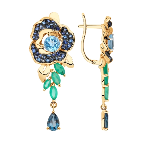 Очаровательные серьги с нежными подвесками и объемным декором в виде цветка украшены зелеными агатами, топазами и цветными фианитами, выполнены из красного золота 585 пробы. Необычный дизайн и яркое сияние разноцветных камней привлекают внимание, украшение создает романтичное настроение, и станет эффектным продолжением притягательного женского образа. Покупайте серьги по выгодной цене в магазинах Мир Золота.