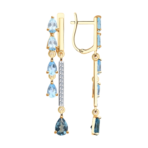 Серьги с подвесками с топазами и фианитами выполнены в изысканном ювелирном дизайне из красного золота 585 пробы. Нежная капель из голубых топазов красиво играет на свету, дорожки из кристальных фианитов выигрышно дополняют цветное сияние камней. Украшение подчеркнет утонченный вкус владелицы, и станет заметным акцентом женственного образа. Покупайте серьги в подарок выгодно в магазинах Мир Золота.