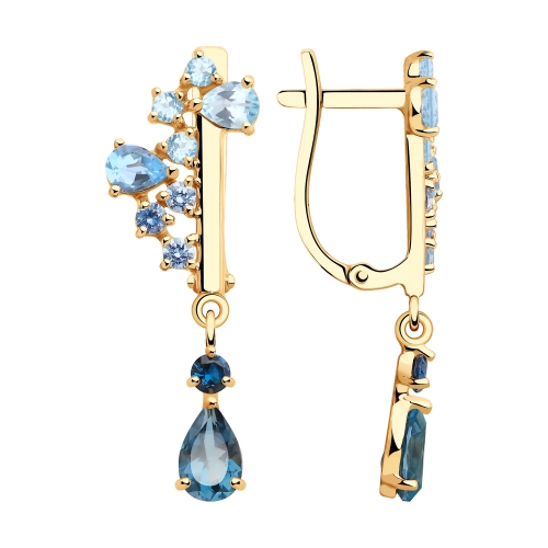 Изящные серьги с подвесками с голубыми и синими топазами и фианитами выполнены из красного золота 585 пробы. Эффектное сочетание подобранных камней, подчеркнутых благородным сиянием золота, притягивает взгляд. Изумительное украшение оттеняет красоту глаз и станет важной деталью различных нарядов. Приобретайте серьги в подарок по выгодной цене в магазинах Мир Золота.