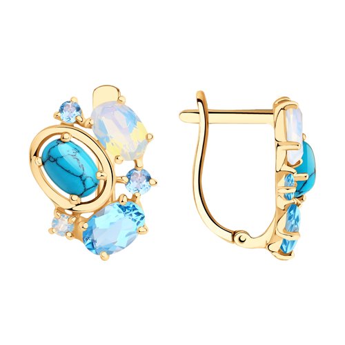 Привлекательные серьги на английском замке с миксом полудрагоценных камней выполнены из красного золота 585 пробы. Необычное сочетание бирюзы, ситаллов и топазов разной формы и оттенков изысканно украсит любой женский образ, яркое украшение станет незаменимой деталью многих нарядов. Приобретайте серьги по выгодной цене в магазинах Мир Золота.