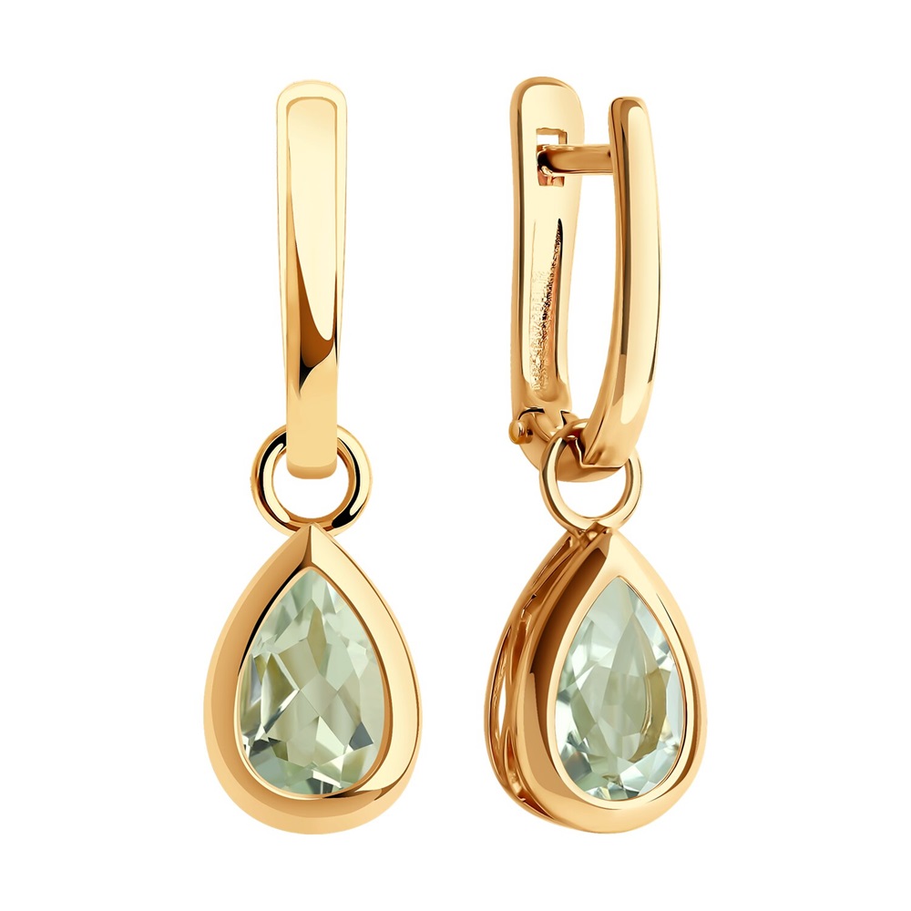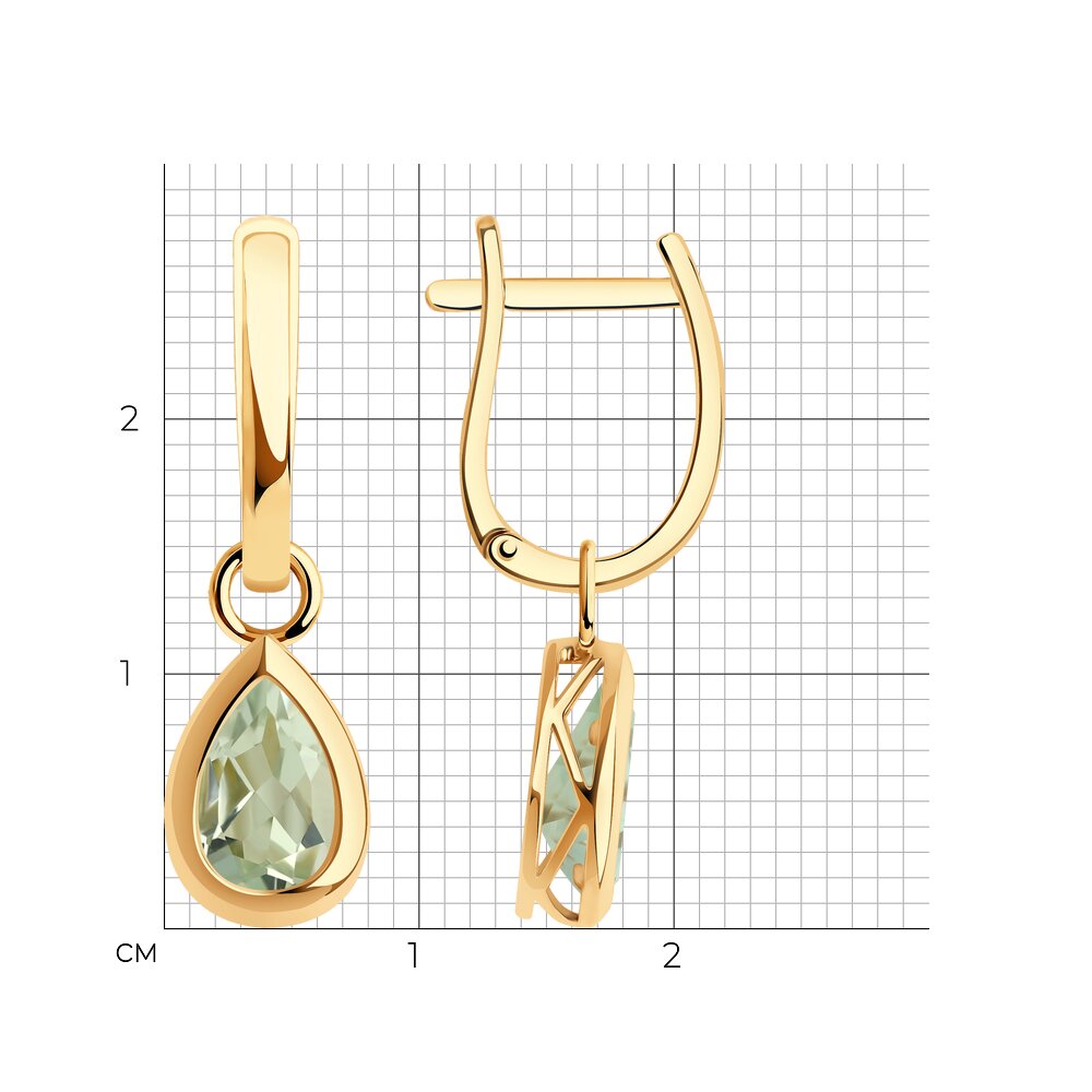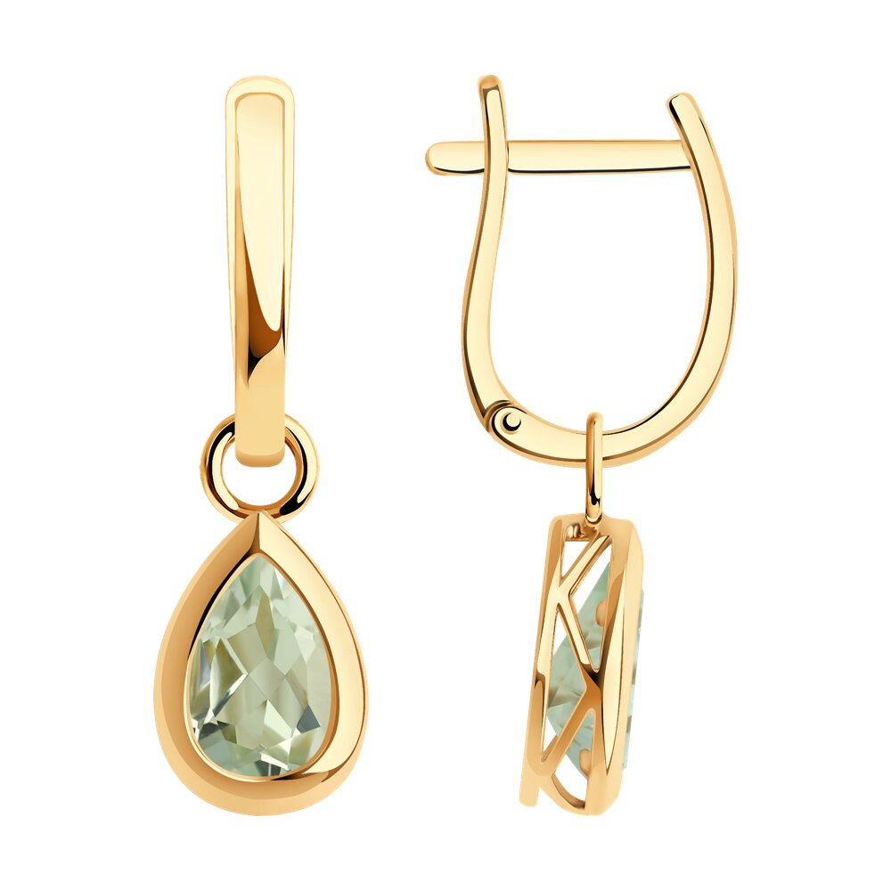Серьги классического дизайна с подвесками с привлекательным празиолитом грушевидной формы выполнены из красного золота 585 пробы. Прозрачное сияние чудесных камней нежно-зеленого оттенка привлекает внимание, украшение станет универсальным дополнением женского образа. Тип замка: английский. Приобретайте ювелирные серьги по выгодной цене в магазинах Мир Золота.