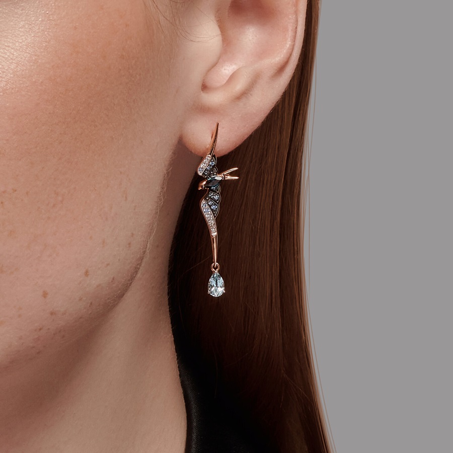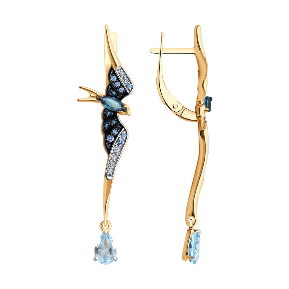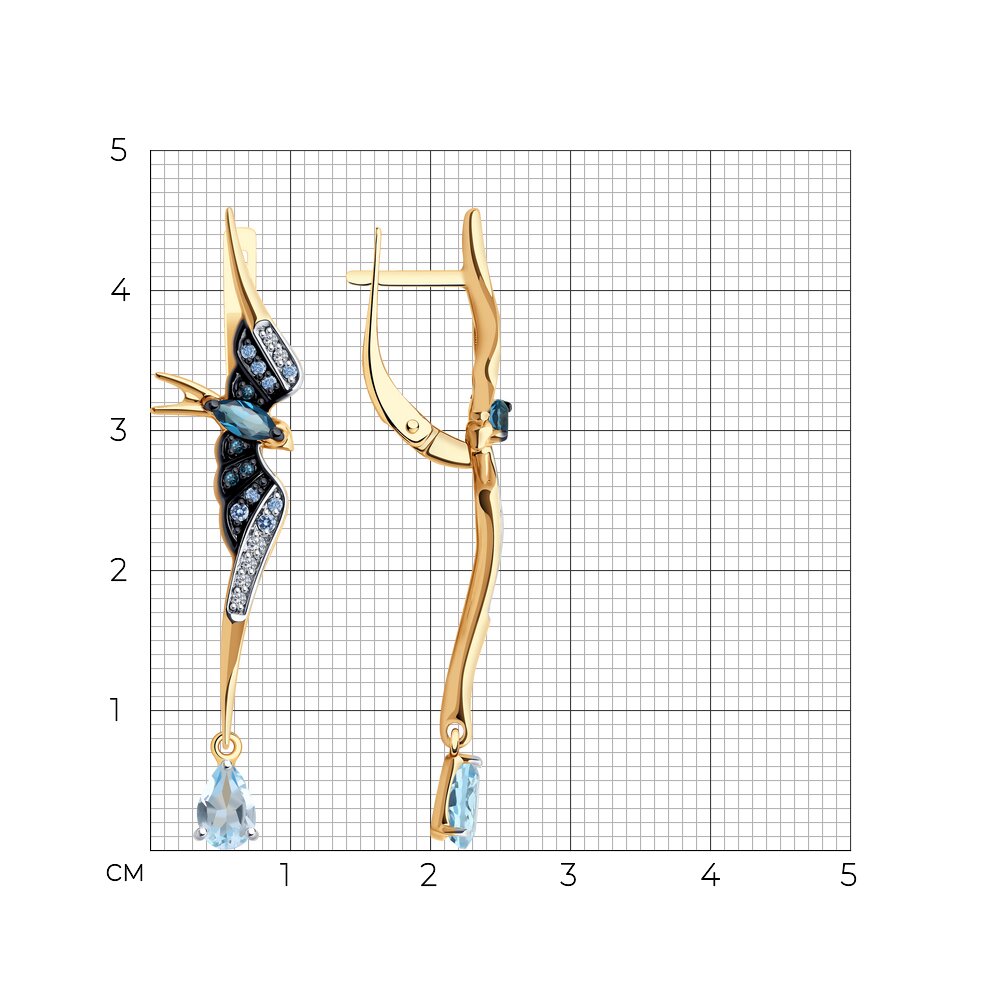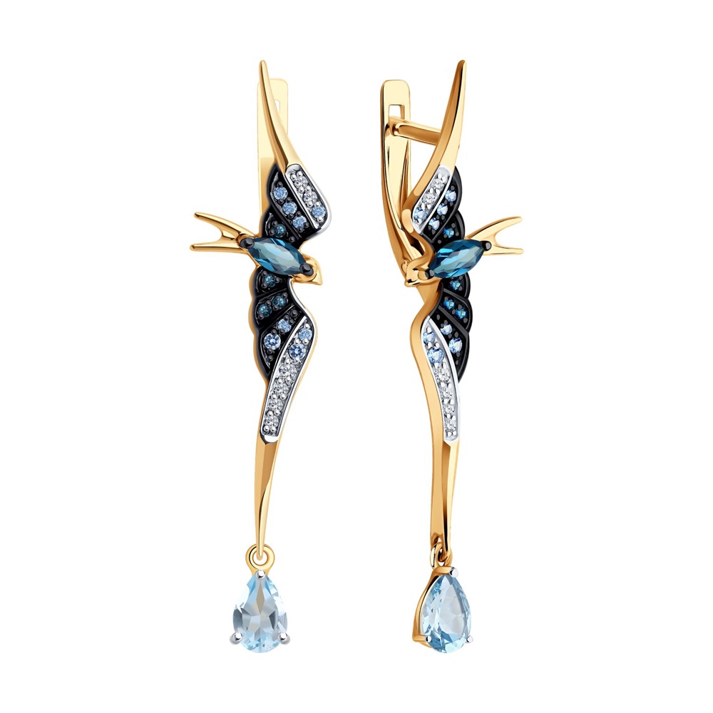 Оригинальные серьги с подвесками выполнены из красного золота 585 пробы с миксом голубых топазов и фианитов. Необычный дизайн украшения привлекает внимание, серьги эффектно смотрятся и отлично дополнят утонченный женственный образ. Приобретайте изумительное украшение для себя или в подарок по выгодной цене в магазинах Мир Золота.
