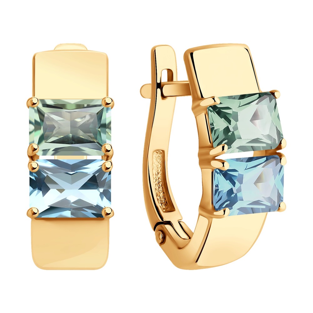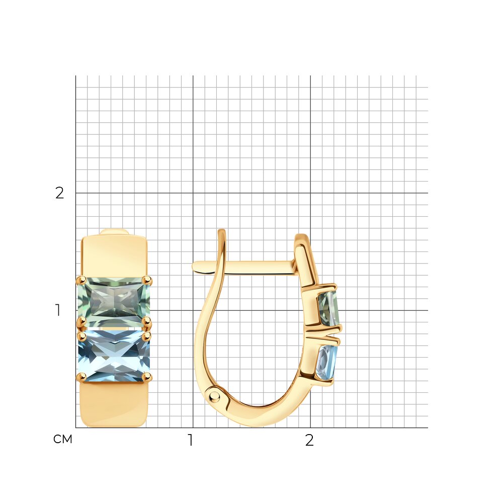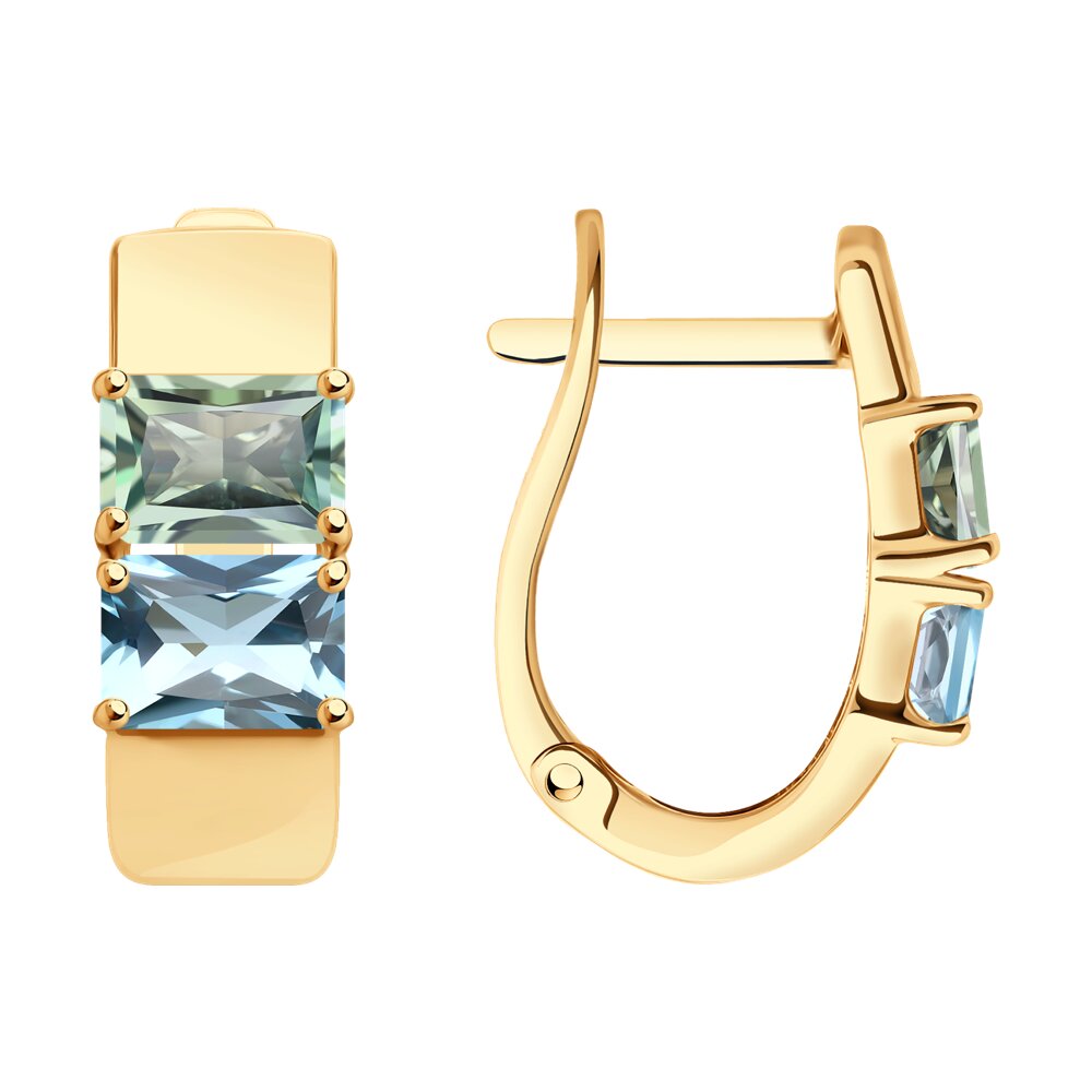 Серьги из красного золота 585 пробы с празиолитами и голубыми топазами. Строгий дизайн украшения с прозрачным сиянием полудрагоценных камней стильно и привлекательно смотрится, и станет универсальным аксессуаром для повседневного делового стиля или элегантного вечернего наряда. Приобретайте серьги по выгодной цене в магазинах Мир Золота.