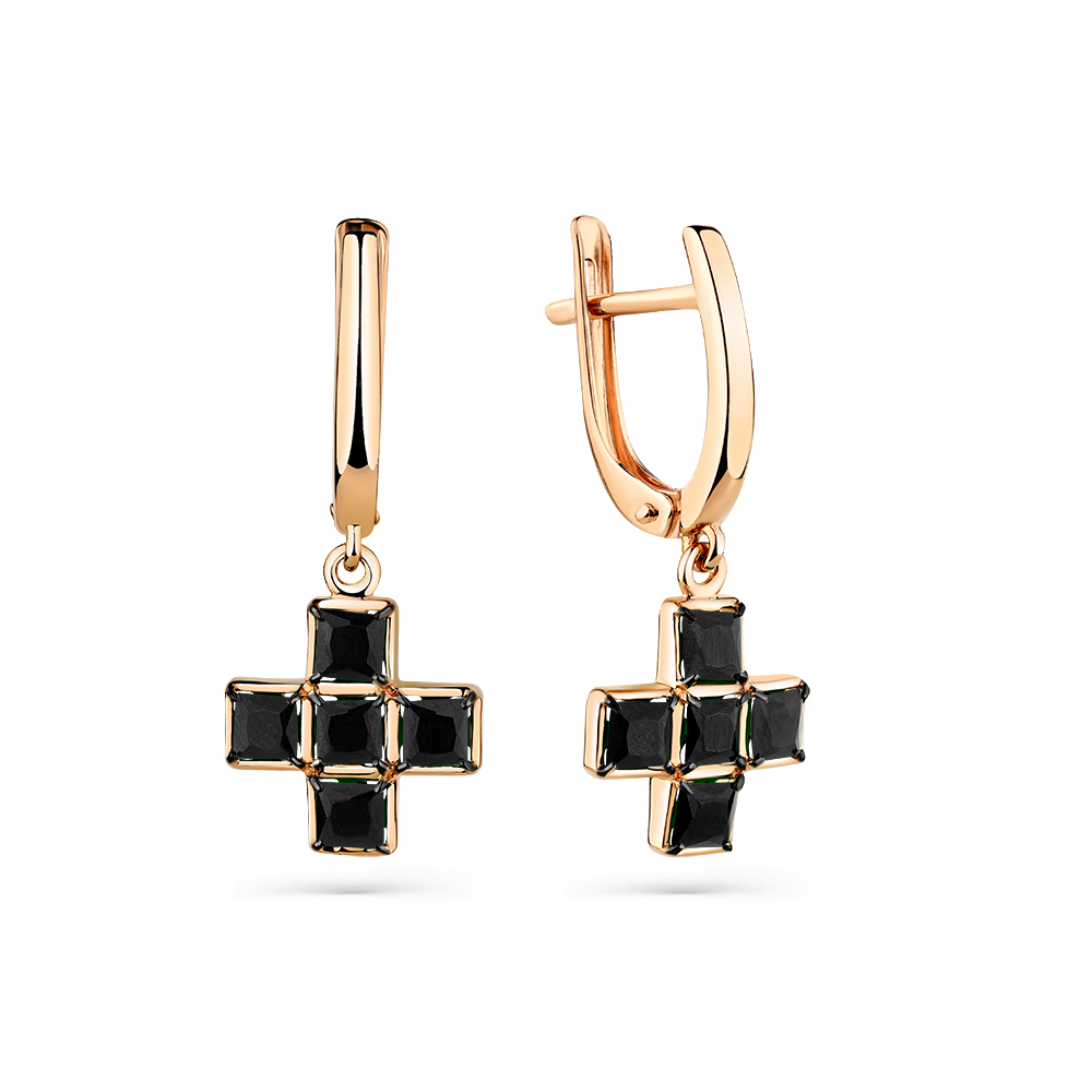 Серьги с подвесками с синтетической шпинелью выполнены из красного золота 585 пробы. Подвески в виде декоративны крестиков из черной шпинели квадратной формы огранки привлекают внимание, украшение стильно смотрится, и отлично впишется в современные образы владелицы. Приобретайте ювелирное украшение по выгодным ценам в магазинах Мир Золота.