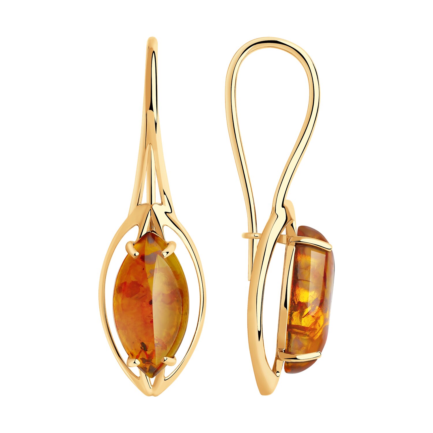 Эффектные серьги с натуральным янтарем изысканной формы огранки выполнены из красного золота 585 пробы. Притягательный янтарь насыщенного теплого оттенка в обрамлении драгоценного металла красиво переливается на свету, излучая неповторимую красоту. Тип замка: французский. Приобретайте ювелирное украшение по выгодной цене в магазинах Мир Золота.