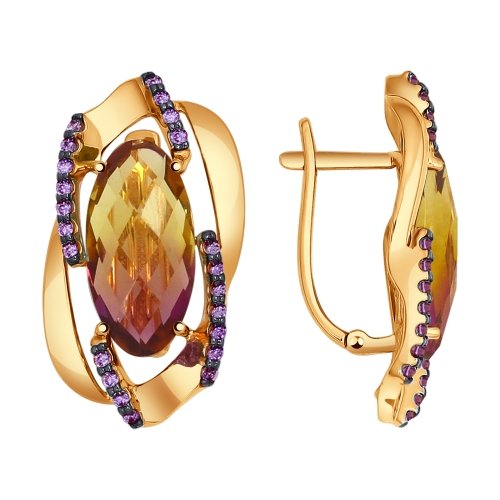 Крупные серьги объемного дизайна из красного золота 585 пробы с ситаллами и цветными фианитами эффектно смотрятся, и обращают на себя внимание. Выразительные ситаллы покоряют своей неповторимой красотой и переливчатым сиянием, сиреневые фианиты выгодно дополняют их удивительный блеск. Украшение прекрасно подойдет к вечернему или праздничному образу, и подчеркнет безупречный стиль владелицы. Приобретайте серьги выгодно в магазинах Мир Золота.