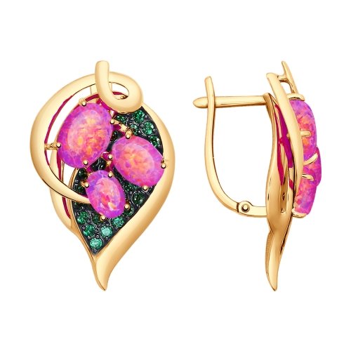 Эффектные серьги оригинального ювелирного дизайна с синтетическими опалами и зелеными фианитами выполнены из красного золота 585 пробы. Яркие розовые опалы на фоне россыпи из зеленых фианитов приковывают внимание, объемные серьги великолепно дополнят стильные современные образы обладательницы. Приобретайте ювелирное украшение по выгодной цене в магазинах Мир Золота.