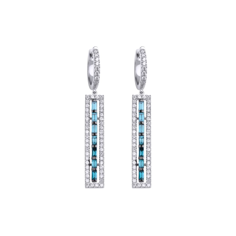 Классические серьги из белого золота, усыпанные бриллиантами, смотрятся солидно, дорого и при этом очень интересно. Геометричная композиция из прозрачных и голубых камней идеальной ювелирной огранки никого не оставит равнодушным! Эффектное украшение станет стильным дополнением современных образов, подчеркнув индивидуальность и безупречный вкус обладательницы. Тип замка - английский. Покупайте эксклюзивные серьги в магазинах Мир золота.