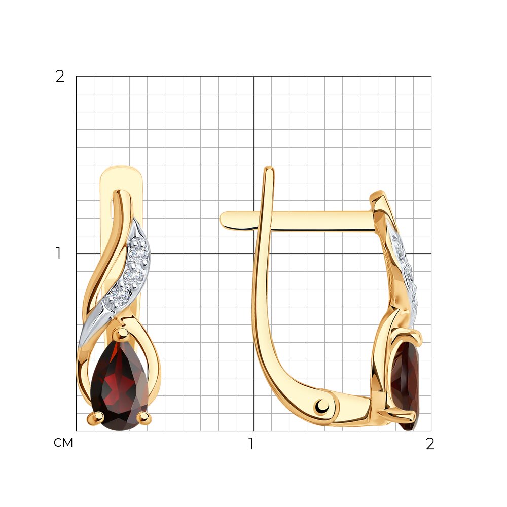 Замечательные серьги прекрасного дизайна выполнены из красного золота 585 пробы и украшены натуральными гранатами и фигурными вставками с фианитами. Серьги смотрятся очень изящно и очаровательно, и станут изумительным украшением нежного образа. Приобретайте ювелирное украшение для себя или для идеального подарка, по выгодной цене в магазинах Мир Золота.