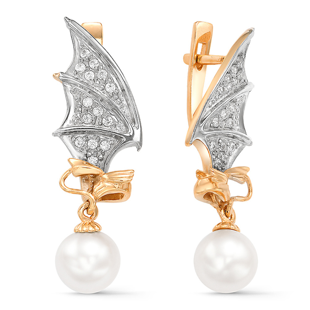 Оригинальные серьги в виде крыльев дракона выполнены из красного золота и украшены россыпью кристальных фианитов и белым жемчугом. Необычный дизайн обращает на себя внимание, и позволит создать эффектный и неповторимый образ, подчеркнув индивидуальность и стиль владелицы. Тип замка: английский. Приобретайте символичное украшение по выгодным ценам в магазинах Мир Золота.