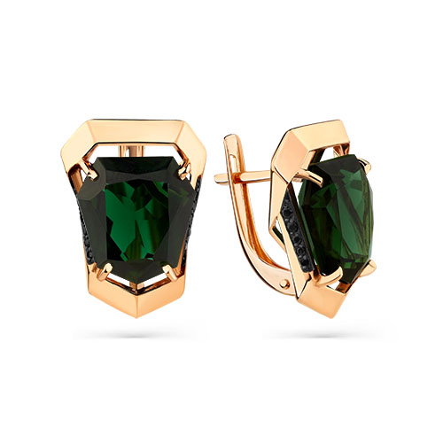 Серьги из красного золота 585 пробы с объемным декором с синтетическими турмалинами фантазийной формы огранки и вставками с черными фианитами. Насыщенный блеск эффектных камней турмалина приковывает взгляд. Серьги придутся по вкусу любительницам необычных и стильных украшений, и отлично впишутся в современный образ, подчеркнув индивидуальность владелицы. Приобретайте украшение выгодно в магазинах Мир Золота.