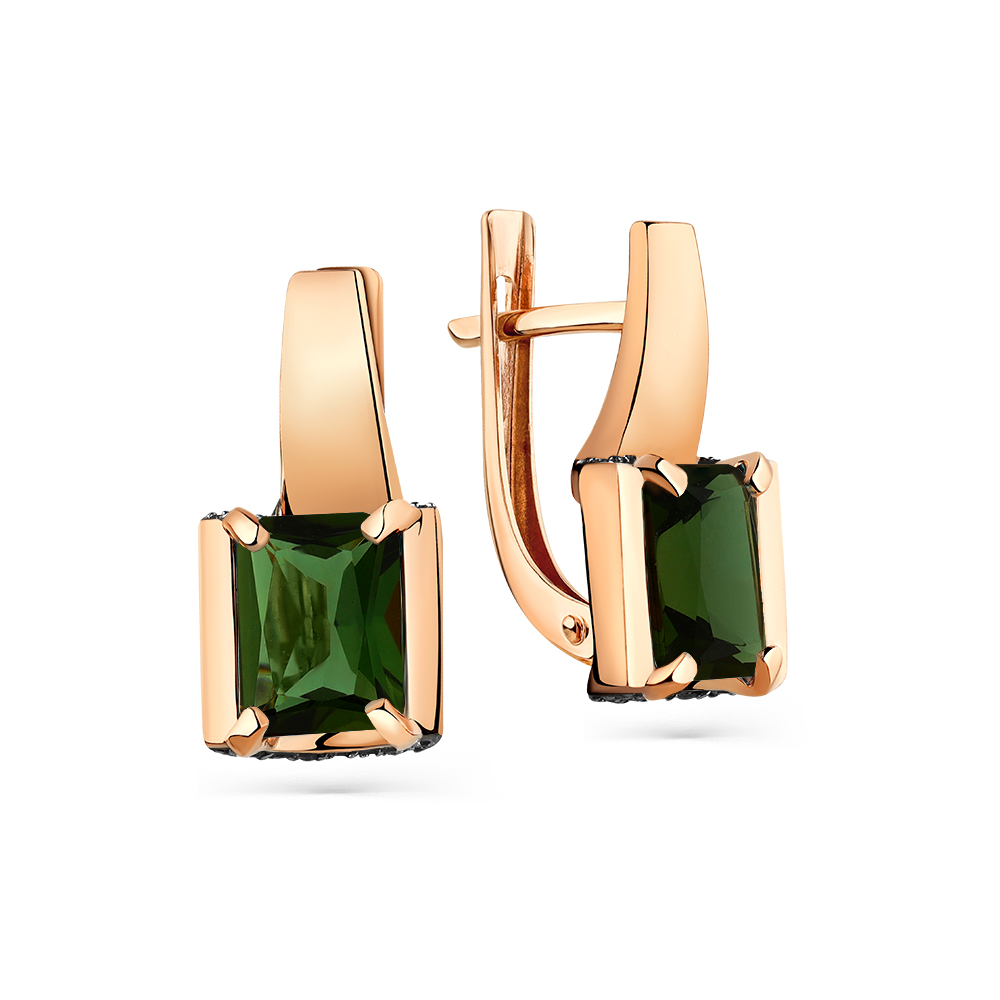 Серьги с английским замком выполнены из красного золота 585 пробы с эффектными вставками с синтетическими турмалинами, подчеркнутыми изящными дорожками с черными фианитами. Украшение привлекает внимание насыщенным блеском ювелирных камней, и станет изысканной деталью современного образа. Приобретайте актуальное украшение в подарок по выгодным ценам в магазинах Мир Золота.