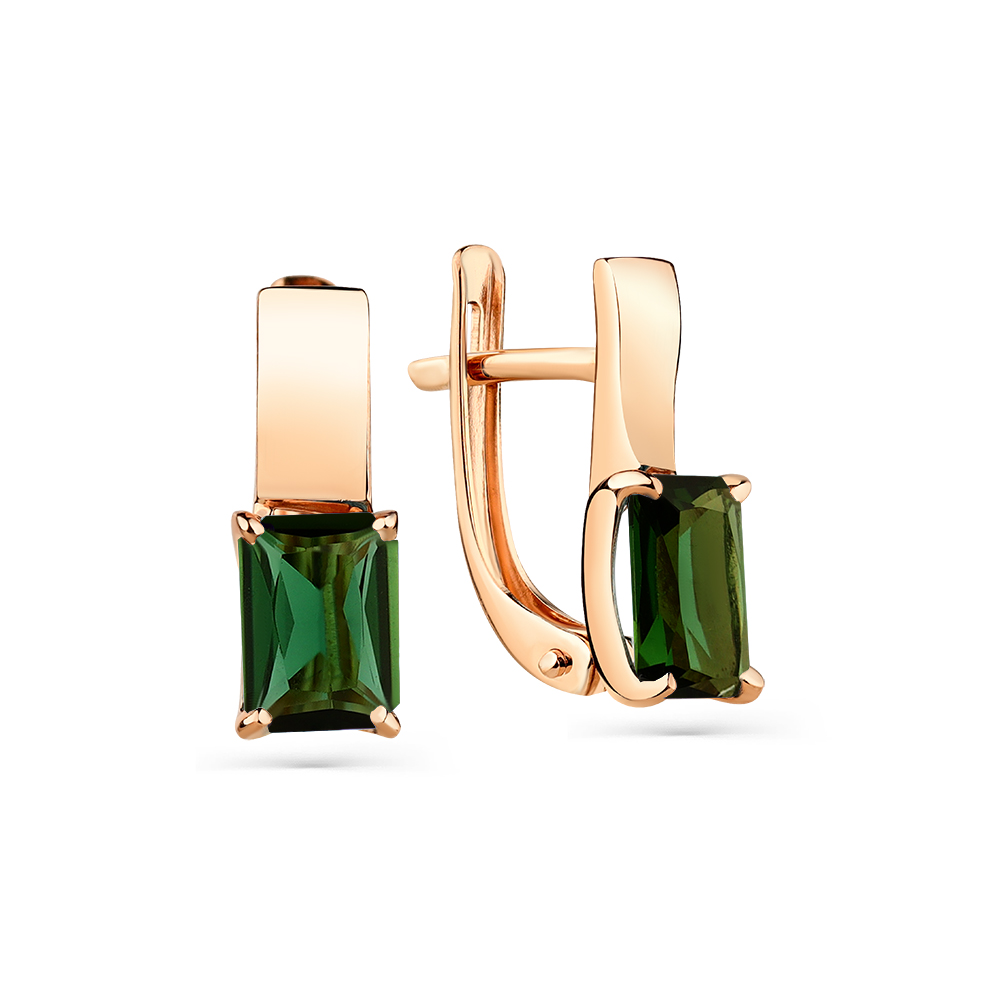 Серьги с синтетическими зелеными турмалинами выполнены в классическом стиле из красного золота 585 пробы. Популярная огранка камней выгодно раскрывает их яркую красоту и насыщенность цвета. Лаконичное, но стильное украшение внесет выразительный акцент в выбранный образ владелицы. Тип замка: английский. Приобретайте ювелирное украшение для себя или в подарок, выгодно в магазинах Мир Золота.