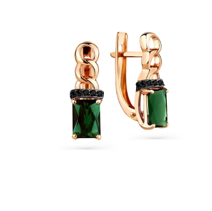 Серьги интересного дизайна из красного золота 585 пробы декорированы синтетическими зелеными турмалинами и черными фианитами. Украшение с насыщенным блеском ювелирных камней привлекает к себе внимание, и станет изысканным дополнением современного образа. Комфортный английский замок надежно зафиксирует украшение. Приобретайте серьги в подарок по выгодной цене в магазинах Мир Золота.