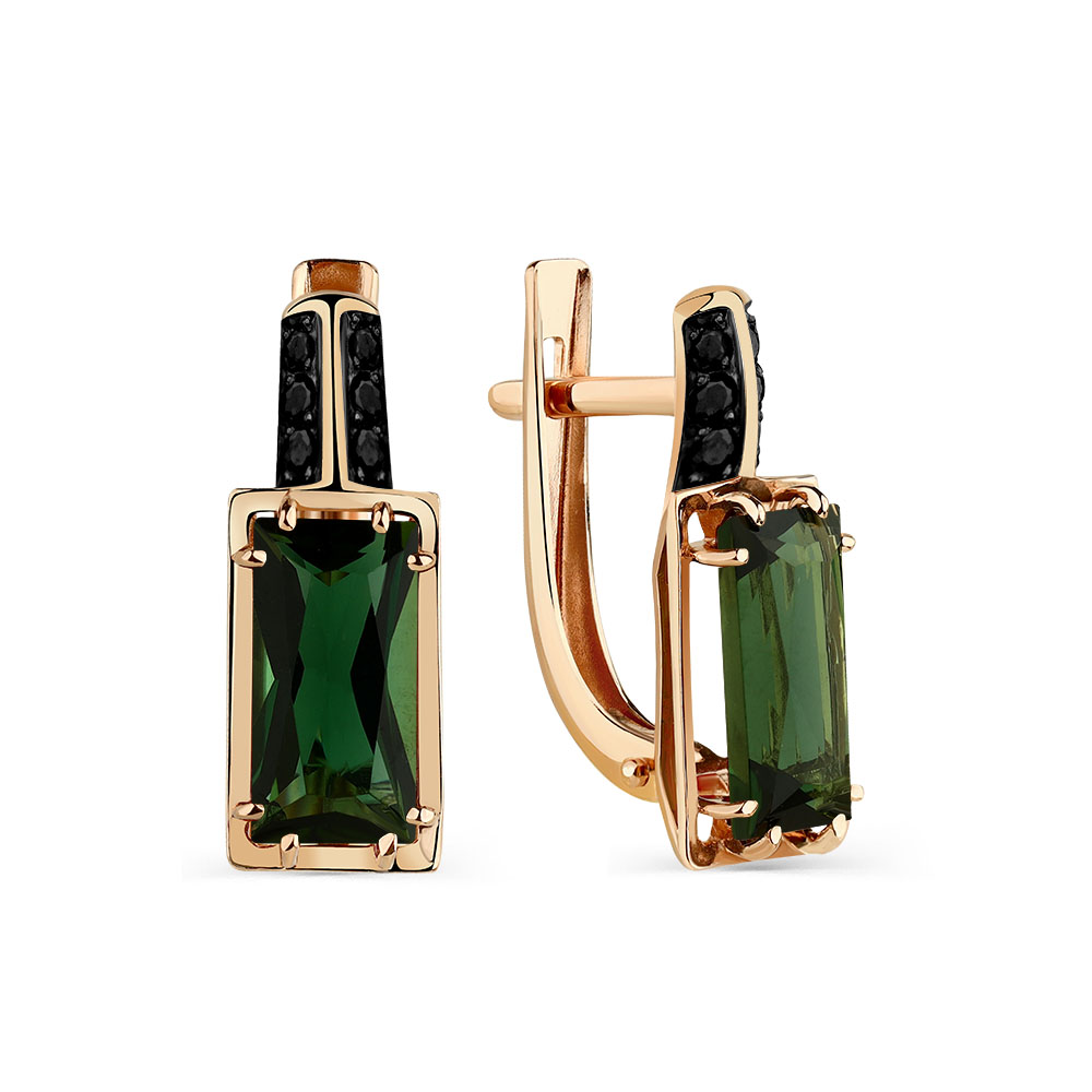 Яркие серьги из красного золота 585 пробы с эффектными вставками с крупными турмалинами выразительной формы огранки и дорожками с черными фианитами. Насыщенный блеск ювелирных камней в обрамлении благородного золота приковывает взгляд. Стильное украшение эффектно преобразит любой привычный образ, добавив ему особого шарма и изысканного блеска. Приобретайте серьги в подарок по выгодным ценам в магазинах Мир Золота.