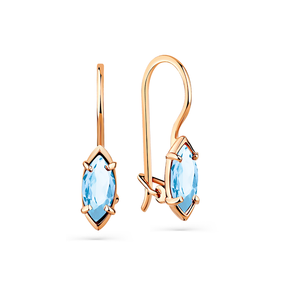 Серьги из красного золота 585 пробы украшены прекрасными натуральными топазами swiss изысканной формы огранки. Драгоценный блеск золота выгодно подчеркивает удивительное сияние лазурных камней, замечательные легкие серьги станут отличным дополнением классических и современных образов владелицы. Покупайте серьги с удобным и надежным французским замком по выгодной цене в магазинах Мир Золота.
