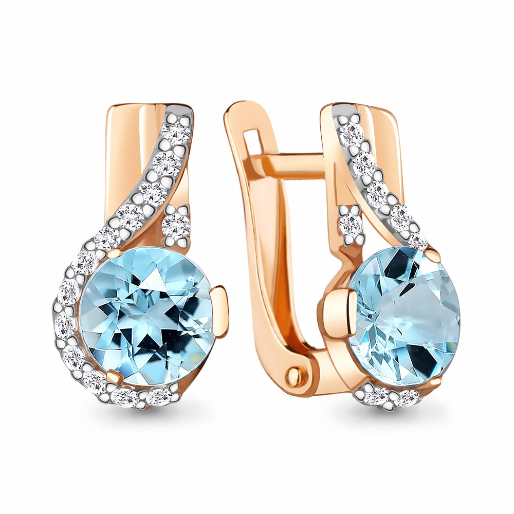 Серьги с голубыми топазами sky и кристальными фианитами из красного золота 585 пробы добавят образу владелицы еще больше женственности и неповторимого шарма. Чистый прозрачный блеск нежно-голубых топазов завораживает взгляд, искристые фианиты, обрамляющие самоцветы, подчёркивают их неотразимую красоту и сияние. Приобретайте серьги с английским замком выгодно в магазинах Мир Золота.