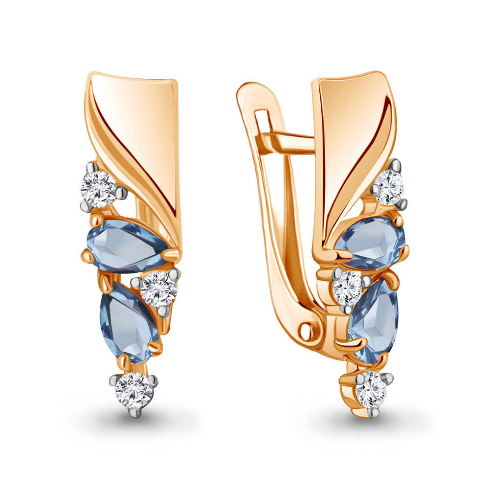 Серьги современного ювелирного дизайна выполнены из красного золота 585 пробы и украшены голубыми топазами swiss и кристальными фианитами. Изумительное сияние ювелирных камней в сочетании с благородным блеском золота привлекает внимание. Стильные серьги эффектно украсят женский образ, и будут превосходным подарком. Приобретайте серьги с английским замком по выгодной цене в магазинах Мир Золота.