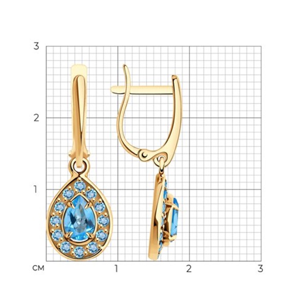 Серьги привлекательного дизайна с подвесками в форме капли выполнены из красного золота 585 пробы и украшены голубыми топазами. Яркое украшение в классическом стиле покоряет своей красотой и изумительным сиянием, и эффектно дополнит элегантный женственный образ. Тип замка: английский. Приобретайте серьги для себя или в подарок по выгодным ценам в магазинах Мир Золота.