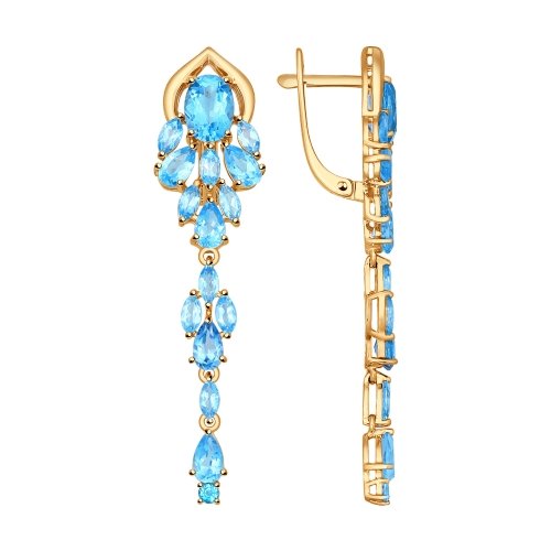 Длинные серьги с подвесками необыкновенного ювелирного дизайна эффектно декорированы натуральными голубыми топазами различной формы огранки. Бесподобные серьги из красного золота с завораживающим блеском камней выглядят оригинально и изысканно, и непременно привлекут восхищенные взгляды окружающих. Это роскошное украшение позволит создать незабываемый великолепный образ. Покупайте серьги по выгодным ценам в магазинах Мир Золота.