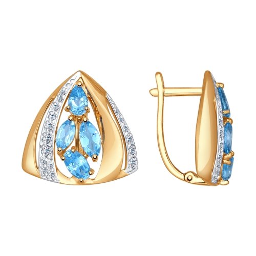Объемные серьги с английским замком, выполненные из красного золота 585 пробы, с натуральными голубыми топазами и прозрачными фианитами подчеркнут женственность и индивидуальность владелицы. Завораживающий блеск ювелирных камней приковывает внимание, украшение роскошно смотрится, и позволит создать превосходный образ. Приобретайте серьги по выгодным ценам в магазинах Мир Золота.