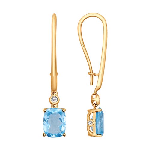 Удлиненные серьги с подвесками с эффектными голубыми топазами swiss, подчеркнутыми сияющими фианитами, выполнены из красного золота 585 пробы. Нежное украшение с ярким прозрачным блеском лазурных топазов очень красиво и женственно смотрится, и станет изысканной деталью неповторимого образа владелицы. Приобретайте серьги с комфортным французским замком для себя или в подарок, выгодно в магазинах Мир Золота.