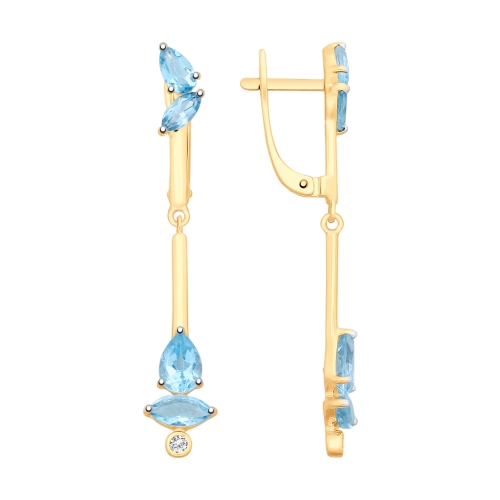Серьги с подвесками с натуральными голубыми топазами привлекательной формы огранки и искристыми фианитами выполнены из красного золота 585 пробы. Необычный сдержанный, но стильный дизайн, с нежным сиянием камней станет изысканным акцентом современного образа, и сделает его более загадочным и притягательным. Приобретайте актуальное украшение для себя или в подарок выгодно в магазинах Мир Золота.