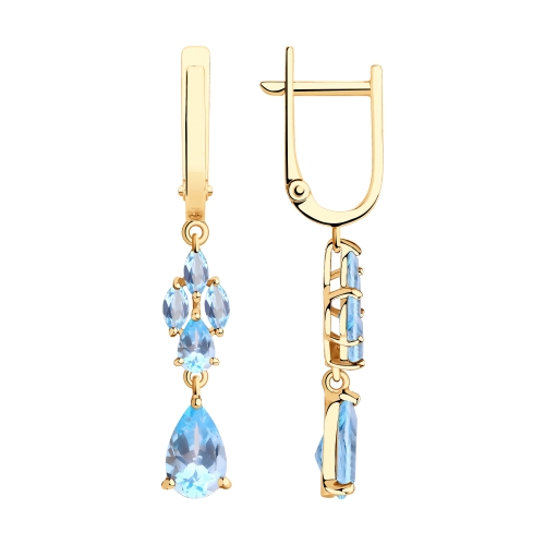 Изумительные серьги с подвесками с натуральными голубыми топазами swiss выполнены из красного золота 585 пробы. Украшение с прекрасными лазурными топазами фигурной формы огранки очень изящно и женственно смотрится на ушке, и идеально подойдет для создания утонченного и притягательного образа. Комфортный английский замок надежно фиксирует украшение. Покупайте серьги по выгодным ценам в магазинах Мир Золота.
